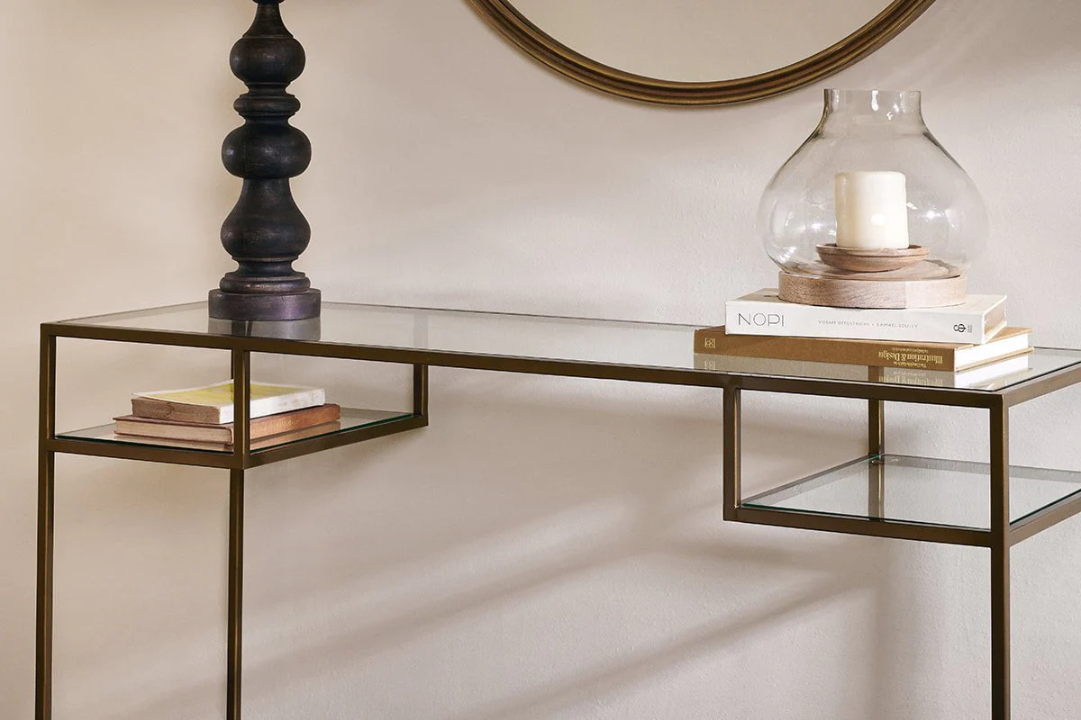 With its warm brass framework and generous glass panels, our well designed Nakuru console table has an elegant, contemporary feel. Two practical compartments make it easy to store your belongings while keeping the top of the table clear for decorative items. Its size and shape mean it’s ideal for positioning in a hallway but its pared back aesthetic makes it a versatile and sophisticated addition for almost any interior. Style with other pieces in the Nakuru collection for a striking and harmonious arrangement.