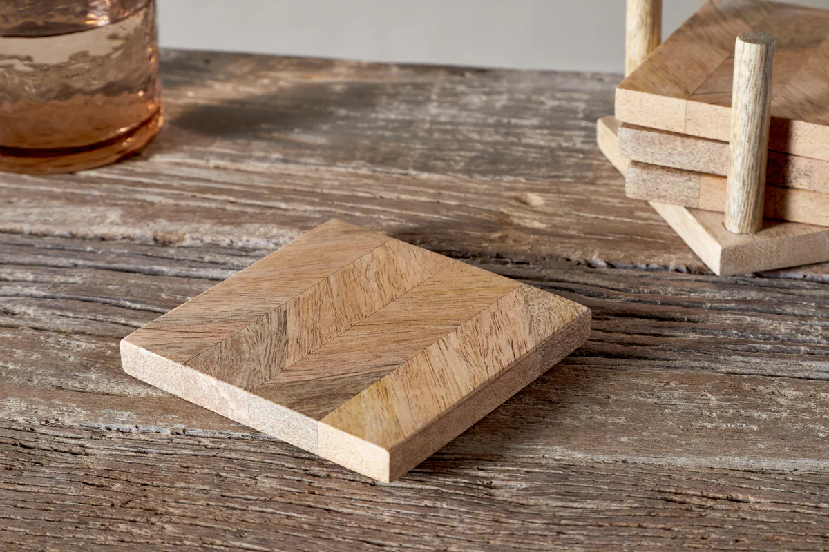 Beautifully practical, this set of four Nalbari coasters is crafted from sustainable mango wood, with each piece showcasing a unique patchwork of natural grain and tone. The coasters are housed in a coordinating mango wood stand, perfect for keeping them tidy when not in use. A warm, textural addition to any tabletop, perfect for both everyday moments and relaxed entertaining.