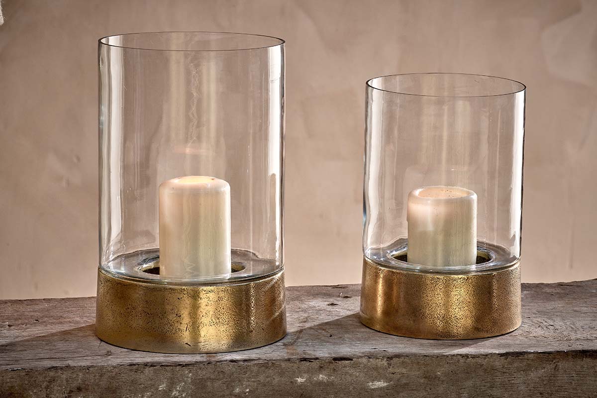 The Rajura hurricane lanterns combine a simple glass design with a deep brass-coloured base. The warm golden hues of brass add a touch of sophistication whilst maintaining a rustic quality with the base cast from aluminium to create an imperfect and interesting texture. Hurricane lanterns are perfect indoors and out; scatter a variety of sizes in your space to create a soft ambient mood. Complete the look with a church pillar candle.